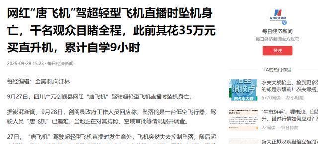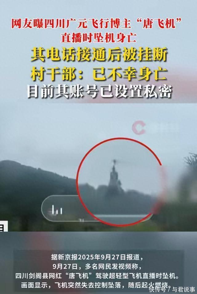 梯田上空的直播悲剧 9月27日14时30分,四川广元剑阁县下寺镇的梯田上空,黄白相间的飞机引擎声打破宁静。 55岁的唐正兴俯身对着手机支架,直播间里1000多名观众正刷着“666”送礼物,他要表演难度颇高的“眼镜蛇”动作。 “看我给大伙儿露一手!”他话音刚落,机头刚要刺破云层,机身突然剧烈抖动。