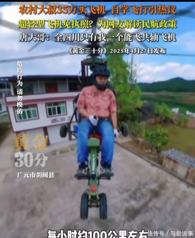 “会飞的铁棺材” 这类民间自制飞行器没有生产资质,也未经任何安全检测,被航空专家称为“会飞的铁棺材”。 飞机的机身是拼接的金属框架,仪表盘极其简易,完全依赖燃油动力,没有任何电子报警系统。 更危险的是,它没有机体保护装置,也没有应急降落伞,螺旋桨离驾驶员极近,座椅简陋难以保持平衡。 而且,唐正兴的飞行技术也令人担忧,他累计自学练飞只有9小时。 在今年他还出现过两次严重事故:3月因油表故障从5米高空坠落;5月又因同样问题从10米高处摔下,全身湿透的他还在直播中调侃"湿身打卡"。
