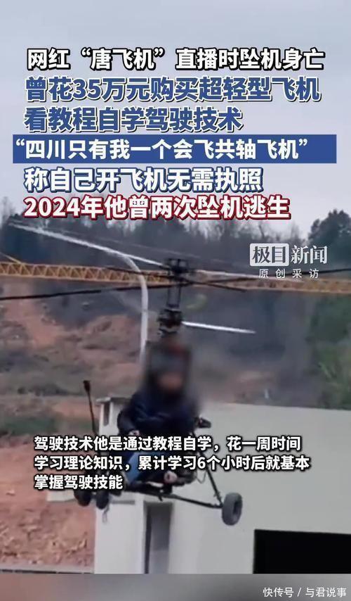 最惊险的一次发生在7月,发动机空中突然熄火,他从高空坠落摔断肋骨,重伤入院。 妻子这次彻底崩溃,强烈要求他停止飞行,唐正兴虽然答应将飞机卖掉,但偷偷的在20公里外的一个废弃厂房偷偷继续直播。 更何况,他在飞行中还常常分心回应弹幕,完全忽视了飞行器需要全神贯注操控的基本要求。